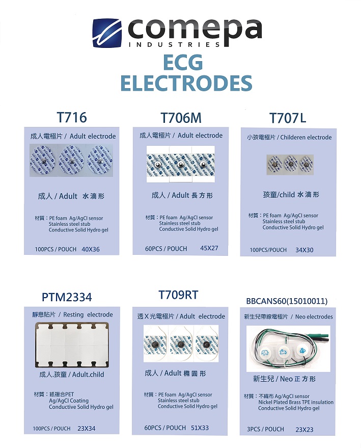 全球領導廠商法國Comepa電極貼片,Comepa電極貼片全系列。黏性好(不易脫落),傳導佳(訊號穩定)的電極貼片。應用於生理訊號量測與訊號傳導,肌電圖,腦波圖,心電圖的電極片。